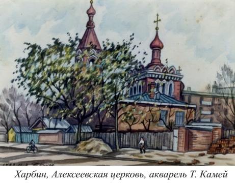 И вдруг в одном из залов, как удар молнии, как гром средь музейной тишины вокруг, передо мной возник величественный неповторимый, узнаваемый из сорока сороков – наш харбинский Храм, наш СОБОР! Стою в оцепенении. Думаю. Надо пойти спросить, как и когда написан. Все ясно, художник написал его не по памяти. Вот и у входа в ограду Собора стоит катафалк. Всё так, как и тогда в далекие времена, значит в храме покойник, ждущий отпевания. Как и тогда лошадь, но не обряжена в погребальную попону. На заднем плане картины слева здание, в нем на первом этаже «Писчебумажный магазин и календари Фоменко». На верхнем этаже – Ильинская больница. Всё, как и было... Собор врезался в память на всю жизнь. Он находился по пути в мою школу на Таможенной улице, пройти мимо было невозможно, чтобы не забежать и не полюбопытствовать, кого хоронят. Это было любопытство подростков, до жгучего страха после увиденного, но пока все же надо было забежать, не страшась смешанного запаха уже начинающегося тлена с запахом ладана.