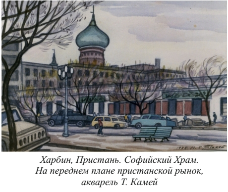 Рядом с изображением Собора картина Софий- ского храма вдалеке, виден только купол, а на переднем его плане пристанской продуктовый рынок, где всегда была масса народа, рынок был богатый разными продуктами летом и зимой. Далее, картина - вход в Успенское кладбище, забытая дорога в «город мертвых», оставленных лежать в чужой земле многими нами, еще живыми и уже ушедшими, Модягоуская Алексеевская церковь, обнесенная старыми домишками. Эти все четыре молчаливых свидетеля прошлого Харбина и тут вдруг где, в Находке, на самом краюшке родной земли! А Япония- то рядом, вот она, и в ней творец этих картин- свидетелей!